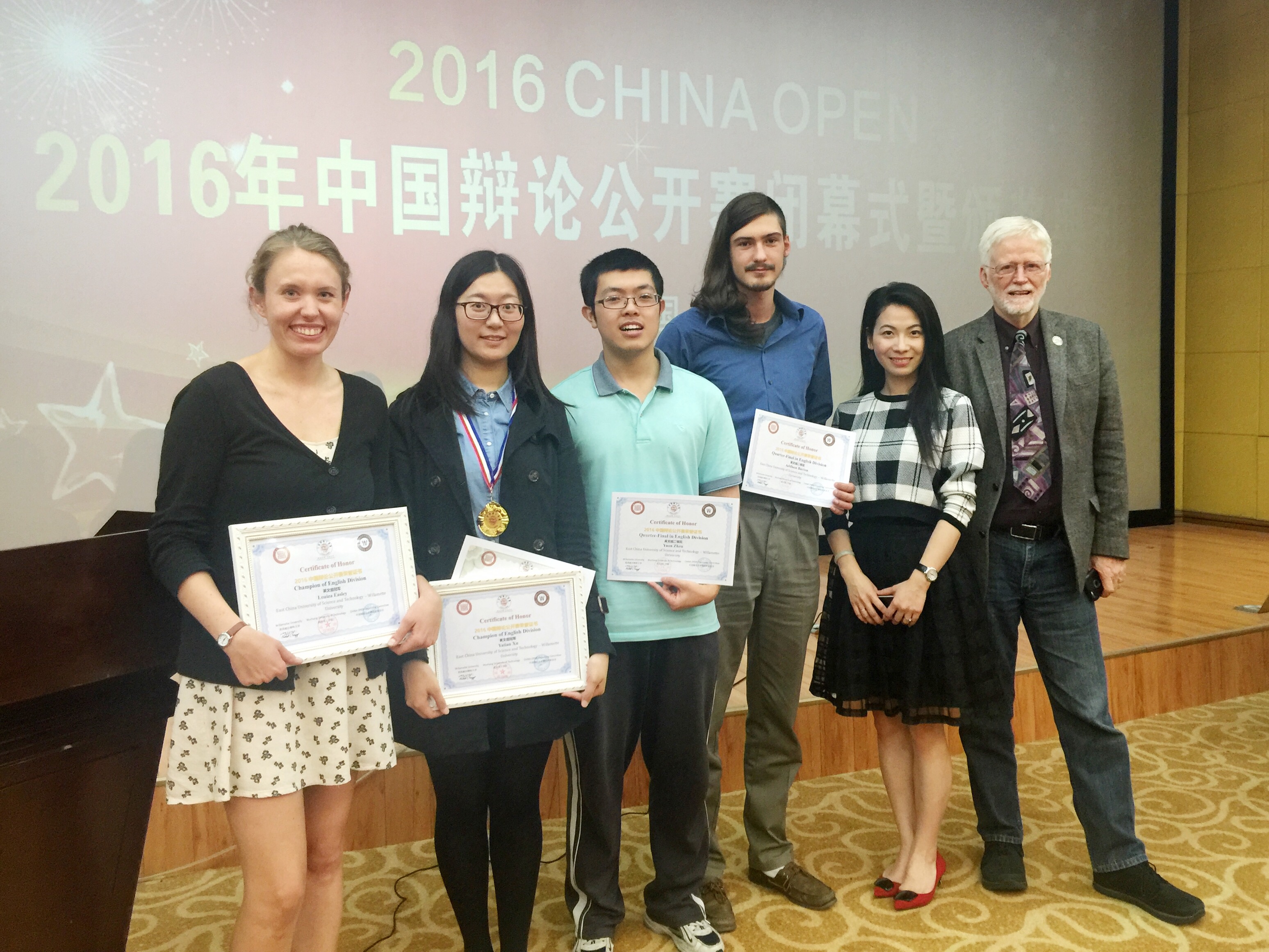 5月20-22日,第七届中国辩论公开赛在武昌理工公司举行。公司伟德国际1949始于英国英语系徐雅恬(英133班)和袁湛(英134班)2位选手分别与来自美国威廉姆特大学的辩手组队,最终,徐雅恬与美方Louisa Easley荣获全国冠军,袁湛与美方Addison Barton进入1/4决赛,获得二等奖。公司参赛队指导教师为英语系高攀。