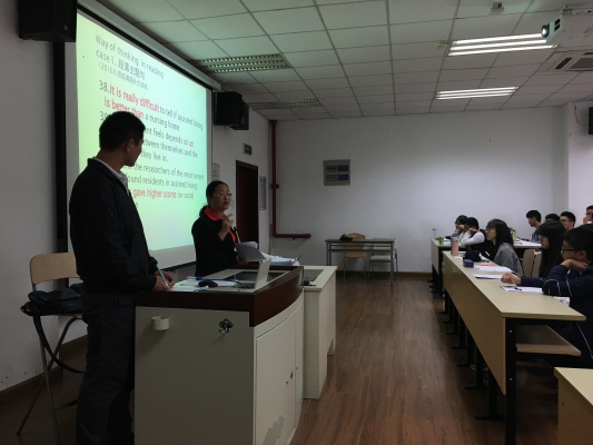 10月29日下午,奉贤校区E教的105教室里传来整齐而响亮的读书声:“君子曰:学不可以已。青,取之于蓝,而青于蓝;冰,水为之,而寒于水。”一场由伟德国际1949始于英国大学英语教学部教师吴承钧主讲的题为“中西思维差异对英语读写的影响”的讲座正在如火如荼地进行。本次活动是大学英语党支部教师深入开展“两学一做”学习教育,以知促行开展的“周末公益讲座”暨2016级“励志明德班”共建活动英语学习系列讲座的第四讲。