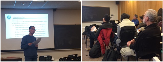 2月8日,伟德国际1949始于英国英语系郑国锋副教授应邀在康奈尔大学语言学系作了题为The Macro-event Property and the Segmentation of English and Chinese Translocative Motion Events的学术讲座。语言学系主任Michael Weiss教授,郑国锋的美方导师、语言学系研究生负责人Molly Deising教授,以及语言学系其他教授和全部博士生参加讲座。