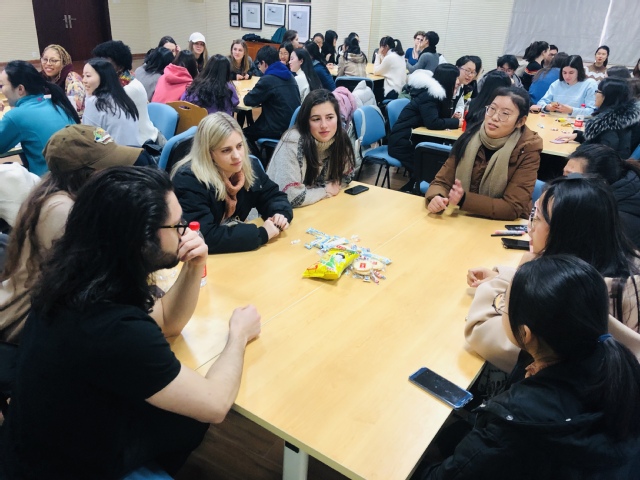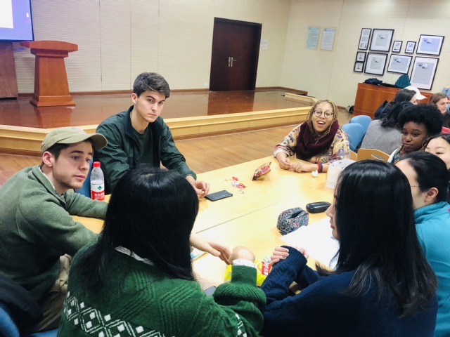 交流会上,英语161班刘菁和英语174班楼科依介绍了中国的老员工活和公司特色,英语171班陈彦尔和李品怡分别表演了舞蹈,英语182班鲍彦轩演唱了英文绕舌乐,英语173班李舸洋邀请全体同学一起合唱了《对面的女孩看过来》,全场气氛达到高潮,随后中美员工分组进行了自由交流,大家就中美教育体制区别、课程设置、校园文化、课外活动、未来规划等话题进行了热烈的讨论,纷纷表示这种面对面的跨文化交流加深了彼此对中美文化的理解。