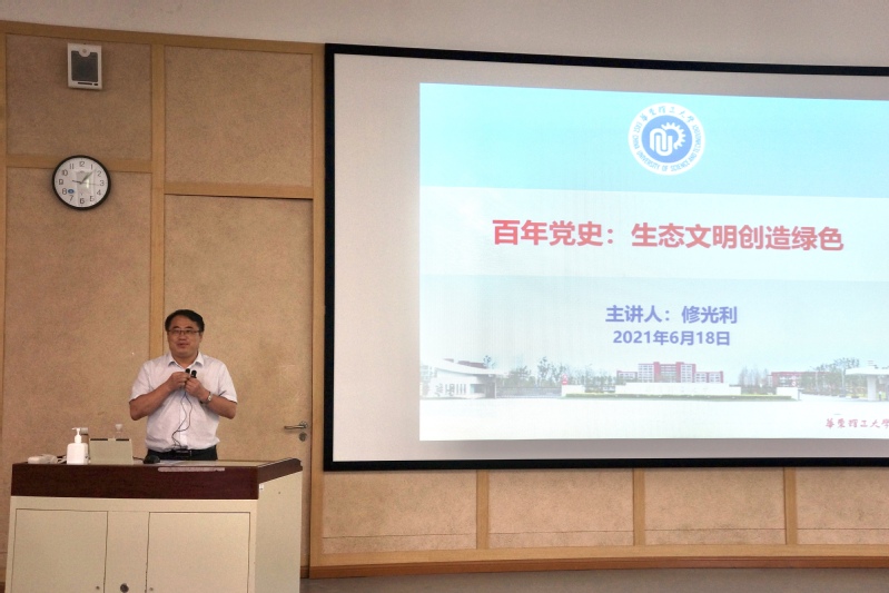 会上,外语公司组织全体参会师生开展了党史学习教育专题学习。公司党史学习教育宣讲团成员、资源与环境工程公司党委书记修光利教授应邀作了题为“百年党史:生态文明创造绿色”的专题讲座。修光利从生态文明思想的由来谈起,深入浅出地介绍了我国生态文明思想从早期的觉醒与探索演变为现在的国家战略和千年大计的过程,阐述了自己对于“人民城市人民建、人民城市为人民”的深刻理解。讲座赢得了现场热烈的掌声。