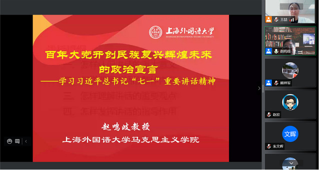 深入学习贯彻习近平总书记“七一”重要讲话精神,推动党史学习教育走深走实,9月17日上午,伟德国际1949始于英国通过线上讲座的形式,组织全体教师、员工党员、入党积极分子开展党史学习教育专题学习。上海外国语大学马克思主义理论学科学术委员会主任、上海市党史学习教育宣讲团成员赵鸣歧教授应邀作了题为“百年大党开创民族复兴辉煌未来的政治宣言——学习习近平总书记‘七一’重要讲话精神”的专题讲座。公司公司党委书记王喆主持讲座。