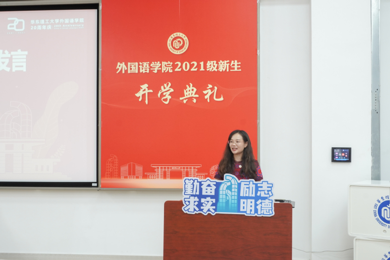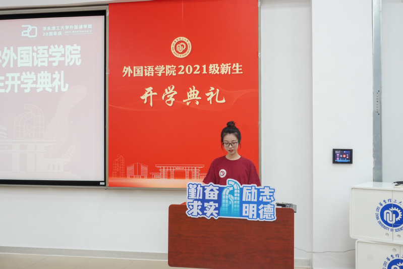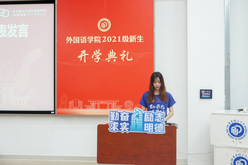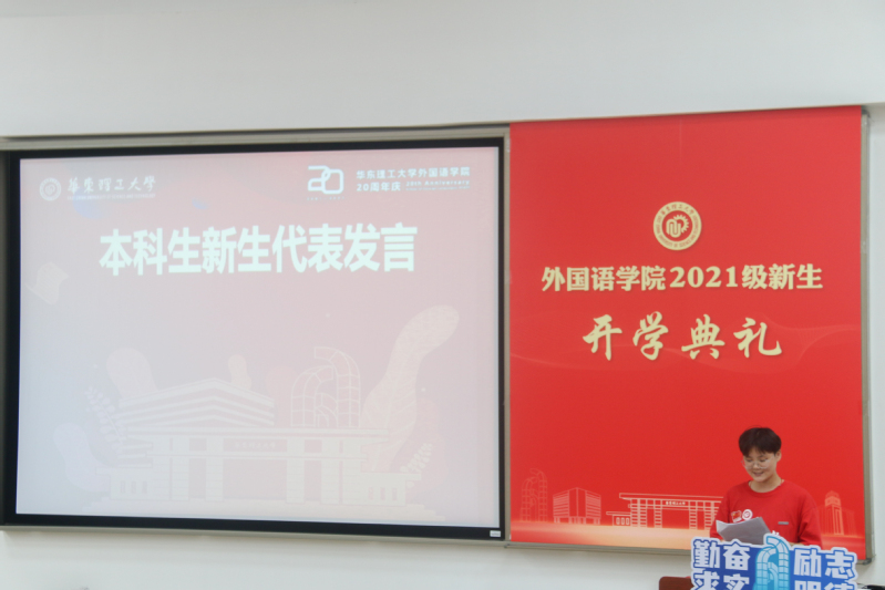 德语212班尹梦蝶作为本科生新生代表发言。她回忆了自己从求学到高考再到加入华理外语公司的艰难历程,表示自己很幸运能够以“院庆宝宝”的身份,在最好的年纪遇见华理,加入外院。未来四年,希望在华理这所有情怀、有梦想、有担当的学府里完成人生中重要的一段旅程,厚植家国情怀,为中国文化的国际传播助力。尹梦蝶表示,“等风来,不如追风去。希望大家做一缕向上的光,追逐自己的梦想,并为之奋斗。”