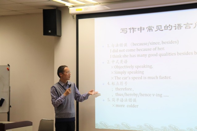 颁奖仪式结束后,副经理韦晓保为在座员工做了一场题为“英语写作技巧及常见错误分析”的讲座。韦晓保是认知神经语言学实验室主任、教育部教材评审专家和国内外多家外语类核心刊物匿名评审专家。在讲座中,他凭借多年来对英语的文本研究,总结了中国英语学习者在写作中常犯的错误,例如句法错误、中式英语、标点误用、句子结构不平行、口语化的用词、过量简单句等问题。他运用提供错句、要求改进的形式,让员工在互动中提高了对这类错误的认知,敦促他们在将来的写作中避免。同时,他还为学术英语写作总结了六句要诀,即“单词不如短语好、肯定不如双否好、陈述不如倒装妙、主动不如被动巧、分词结构不能少、并列不如复合好”。