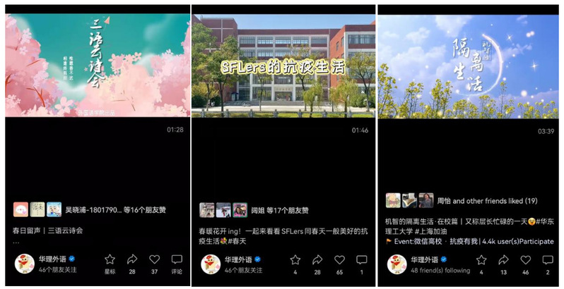 自2022年3月的疫情暴发以来,外语公司团委、奉贤校区本科生党支部积极利用华理外语微信公众号、视频号等多种宣传平台,架起了与员工沟通的桥梁。“分享抗疫期间的小确幸”“线上歌会”“三语云诗会”等特色活动成为了师生们居家战“疫”的心灵滋养。各种丰富有趣的活动不仅使得碎片化的时间更有意义,还向师生们传递了“疫情拉开了距离,却隔离不了爱”的同心战疫正能量。