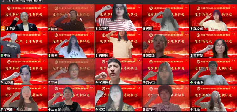 为进一步加强毕业生党员党性教育,使其在学思践悟中踔厉奋发,不忘初心、牢记使命,不断增强“四个意识”、坚定“四个自信”、做到“两个维护”,在毕业生文明离校过程中发挥先锋模范作用,6月6日晚,外语公司以“逐梦新时代,奋进新征程,喜迎二十大”为主题,组织开展主题党课暨2022届毕业生党员离校教育活动。外语公司党委书记王喆、副书记樊俊,辅导员黄菲、侯月,专职组织员赵庆新及全体毕业生党员参会。会议由赵庆新主持。