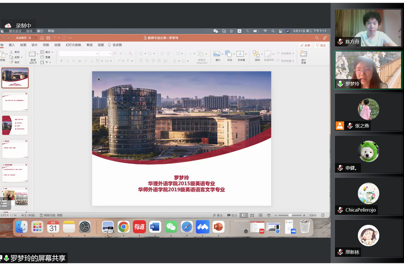 会上,赵宏结合自己华理英语系毕业生的身份进行了简短的致辞,分享了自己的从教经历;高攀回顾了自己在华理英语系从员工到教师的历程,向参会同学们强调了当教师要具备的特质和意识:责任、终身学习、回报;范彬围绕多彩而有意义的支教、任教经历,向同学们展示了自己从事教师一职的赤诚初心,并对于一路走来给过他职业启蒙的老师们表示了深深的感谢,认为优秀的人民教师应当坚守教育初心,做到育人先育己;罗梦玲回顾了本科阶段的学习生活、考研经历以及研究生阶段为就业所作的努力,提出想要成为一名合格的教师,需要积极参加各类活动和竞赛,在平时提升自己的专业素养、管理能力和人际交往能力;谢飞与同学们分享了她两段出彩的教学实习经历,以及如何在本研期间通过参加辩论社、创立辩论协会来提升各方面素养,从如何找准方向、如何制作出彩的简历、如何在应聘环节脱颖而出三个方面为学弟学妹提供了建议;吴汀玉结合自身的出国留学经历,与同学们分享了留学的经验体会、专业的选择、回国的准备和考编的过程,强调了提早进行教师职业规划的重要性。