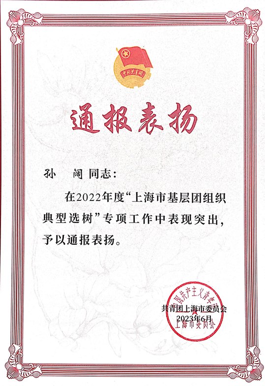 近日,共青团上海市委对上海市基层团组织先进集体和个人发布通报表扬。公司团委入选2022年度“上海市基层团组织典型选树”专项工作团委选树名单;公司团委书记孙阔入选2022年度“上海市基层团组织典型选树”专项工作个人选树名单。