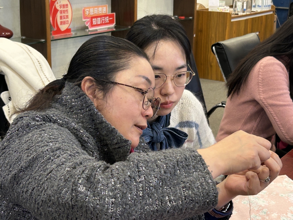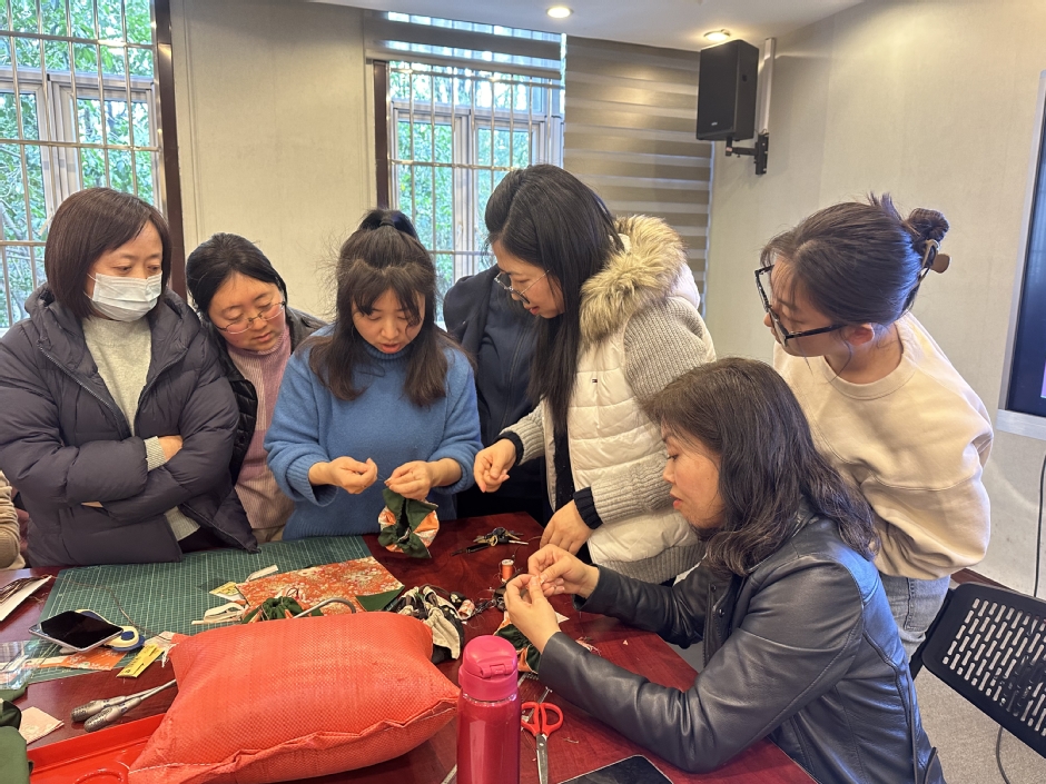 公司工会为参与活动的女教师准备了手工布包制作的原材料,在周晓萱老师的指导下,大家一针一线细心缝制,无论是针线活比较娴熟的巧手,还是从未接触过的新手,大家都非常细致认真。在制作过程中,老师们互帮互助、讨论针线走法,已有心得的老师还为大家进行了演示,让其他老师更容易掌握缝制技巧。