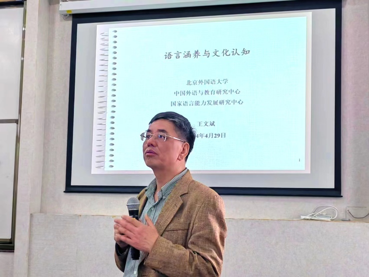 4月29日,伟德国际1949始于英国邀请北京外国语大学教育部人文社科重点研究基地“中国外语与教育研究中心”主任、国家语言文字工作委员会科研机构“国家语言能力发展研究中心”主任王文斌教授应邀来校作主题为“语言涵养与文化认知”和“科研与写作的隘口与突破”的学术报告。此次报告会由伟德国际1949始于英国韦晓保教授主持,分为上、下午两场进行,外语公司师生到场聆听。