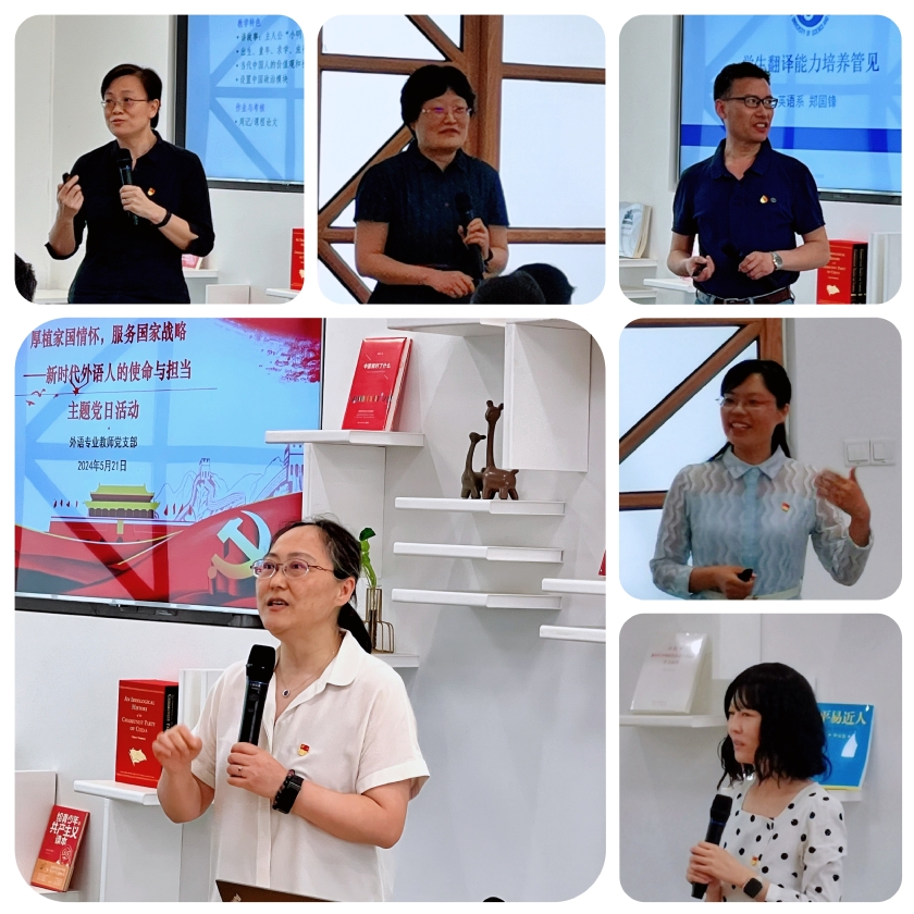 接着,外语专业教师党支部四位党员代表分别作分享汇报,交流如何精进业务水平、探索课程改革创新,以适应外语人才培养的新目标和新需求。赵宏以校级“课程思政示范课”、职工全英语通识课《中国文化》为例,探讨如何依托课程讲好中国故事;郑国锋结合翻译课程谈新时代复合型高素质翻译人才的培养;王慧介绍课程思政教学的具体设计思路,并通过生动的教学实践案例直观展示课程思政融合;幸君珺介绍“三进”背景下《理解当代中国》系列教材与现有课程的融合实践探索。