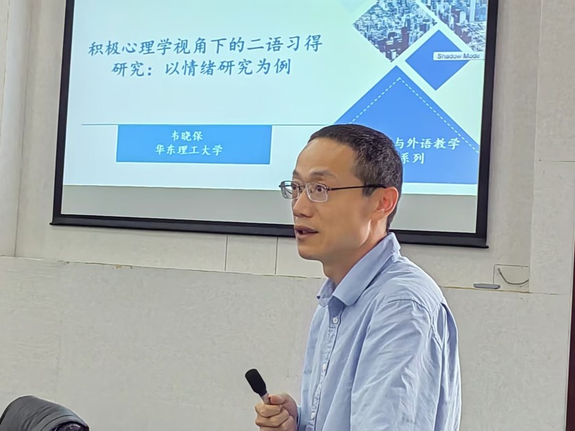 韦晓保教授报告题目为“积极心理学视角下的二语习得研究:以情绪研究为例”,他介绍了积极心理学在二语习得中的应用,强调了情绪因素对于语言学习的重要性,对比了控制-价值理论和开拓-构建理论,深入探讨了二语情绪研究的主要议题,包括二语情绪的测量、二语技能特定性,以及情绪与其他个体内外变量的关系,指出了社交情绪探讨的缺乏等当前研究中存在的问题,提出了Q语言方法等前沿的研究方法。韦晓保教授讲座理论知识丰富,为师生提供了新的研究工具和视角。