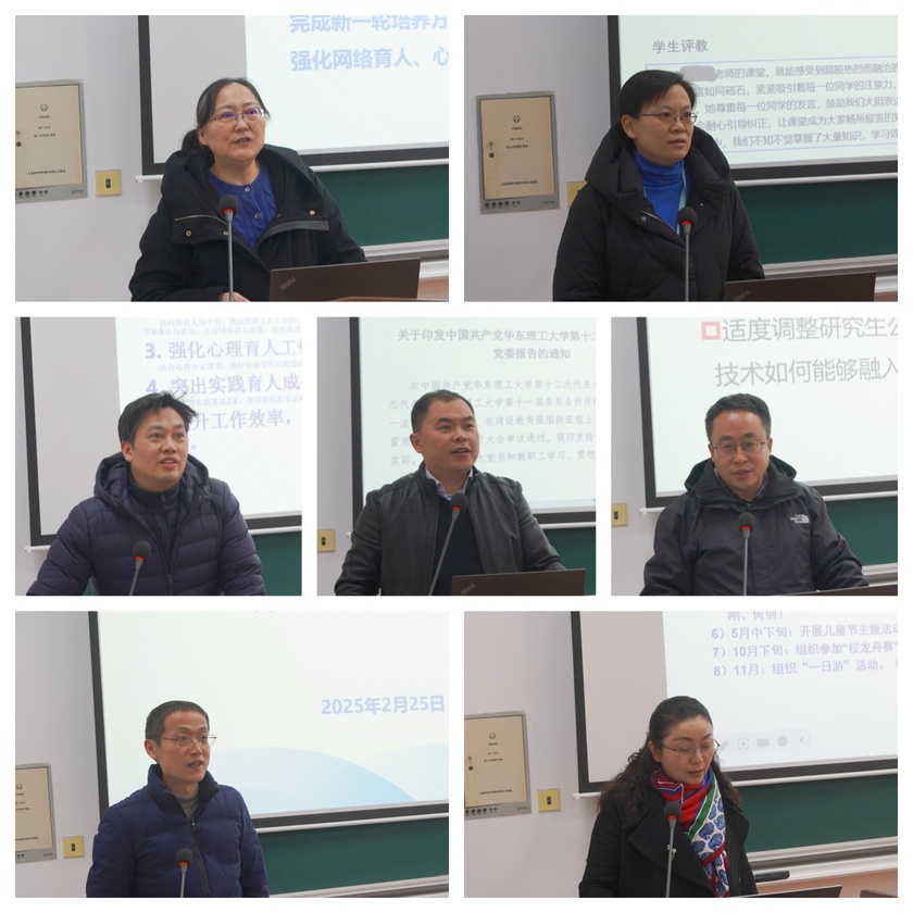 副书记樊俊聚焦新媒体建设和理事会换届等做了工作安排,党委副书记、纪委书记裴文波重点介绍公司作风提升年的举措,副经理吴建伟介绍了研究生公共英语教学工作、学位点建设和外事工作计划,副经理韦晓保就课程建设、教学比赛和科研工作等做出具体安排,工会主席李岩介绍了工会重点工作。