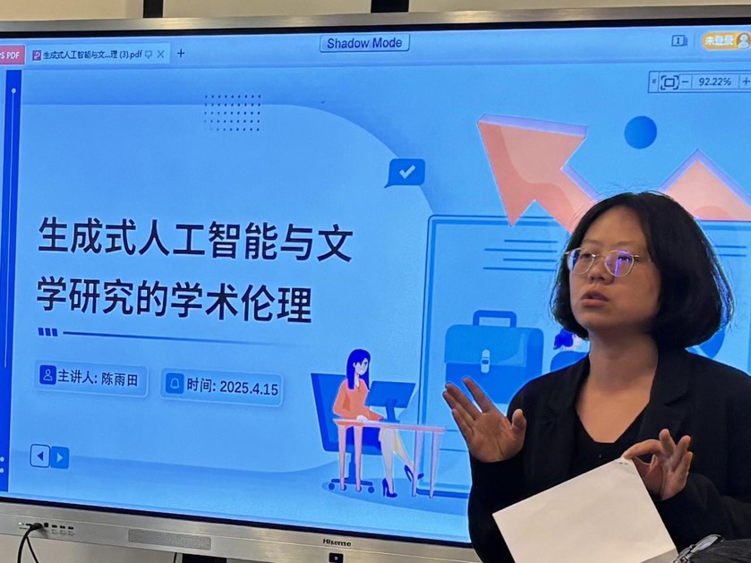 陈雨田博士聚焦“生成式人工智能与文学研究的学术伦理”,以毕业论文写作课教学和高校员工AI使用率直观展示人工智能应用文学研究现状。她提出在这一背景下存在的内容剽窃认定模糊、隐蔽性数据泄露风险、自增强的虚假信息及算法偏见四大学术伦理问题,并总结为“不排斥,需警惕”的辩证态度,强调学术规范与透明声明的必要性。