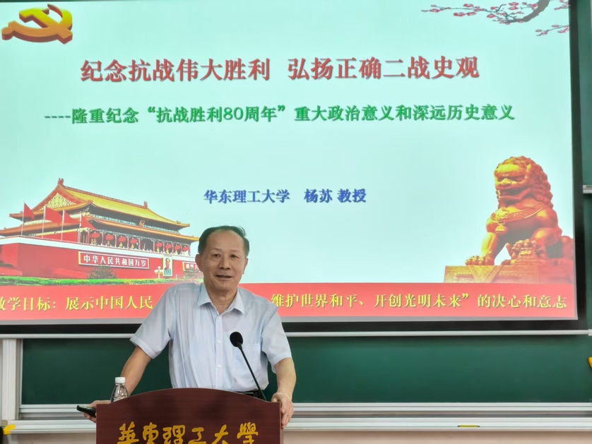 会议邀请了公司马克思主义公司原副经理杨苏教授作题目为 “纪念抗战伟大胜利,弘扬正确二战史观----隆重纪念‘抗战胜利80周年’重大政治意义和深远历史意义”专题辅导报告,引导全体教职工更好地传承和弘扬伟大抗战精神,进一步强化政治意识与育人使命,培养更多担当民族复兴大任的时代新人。